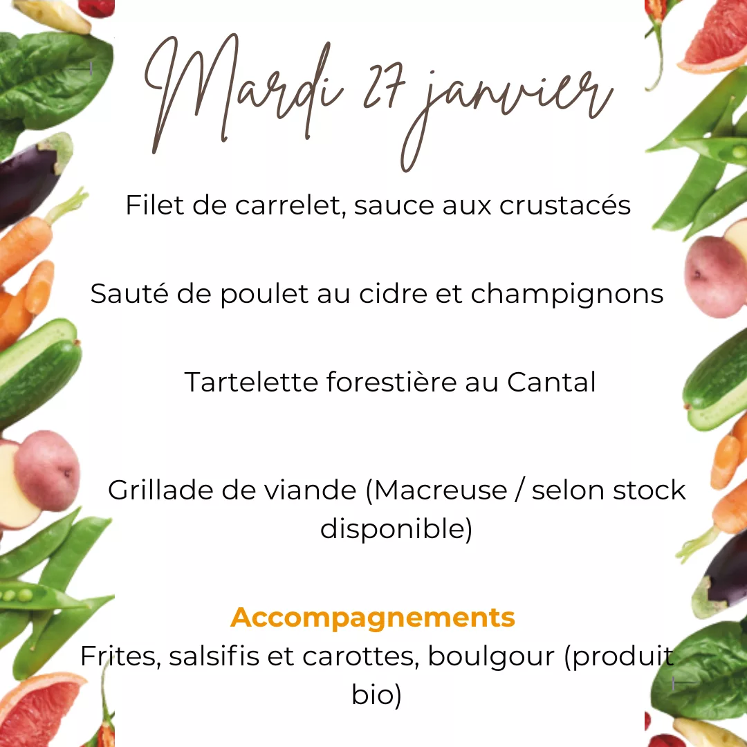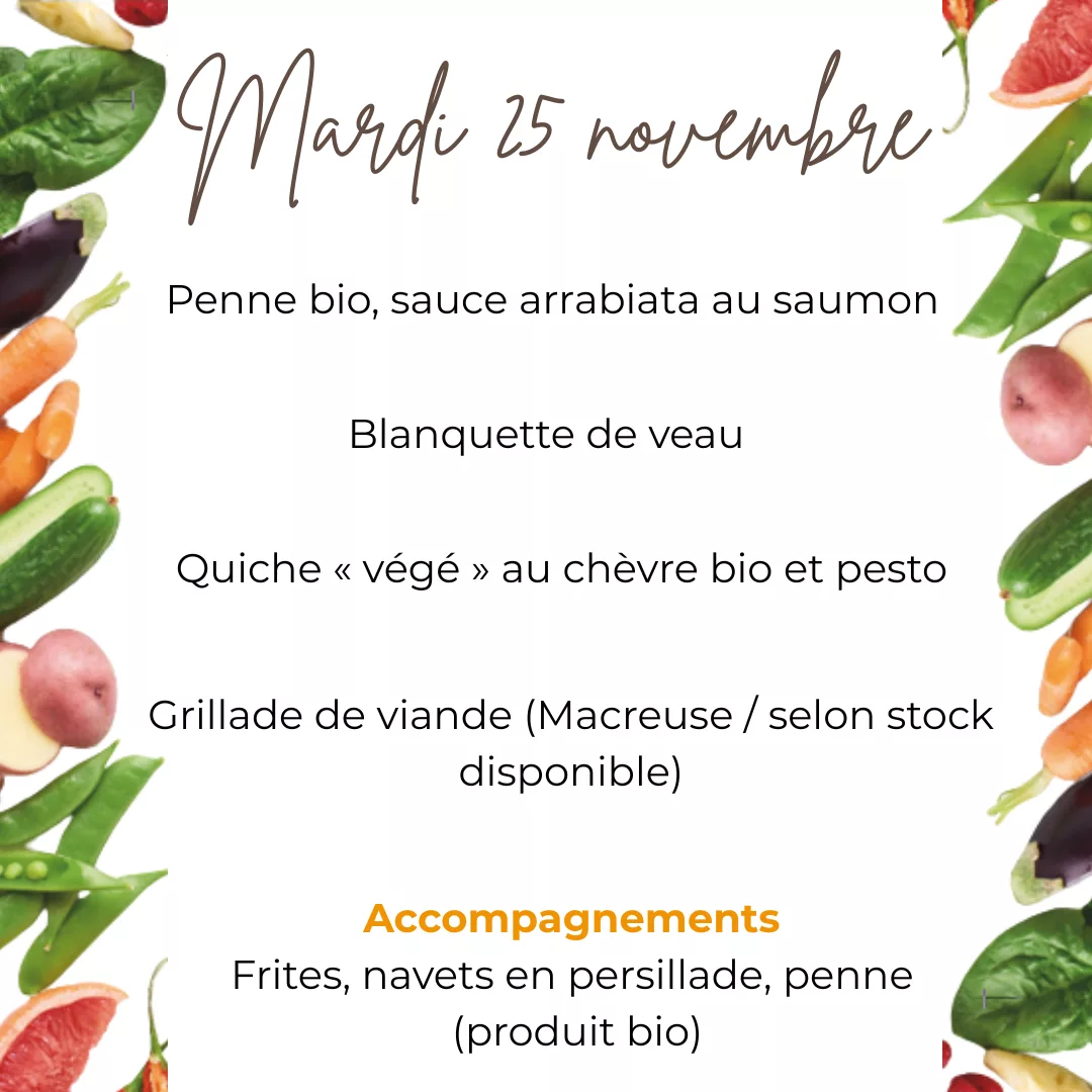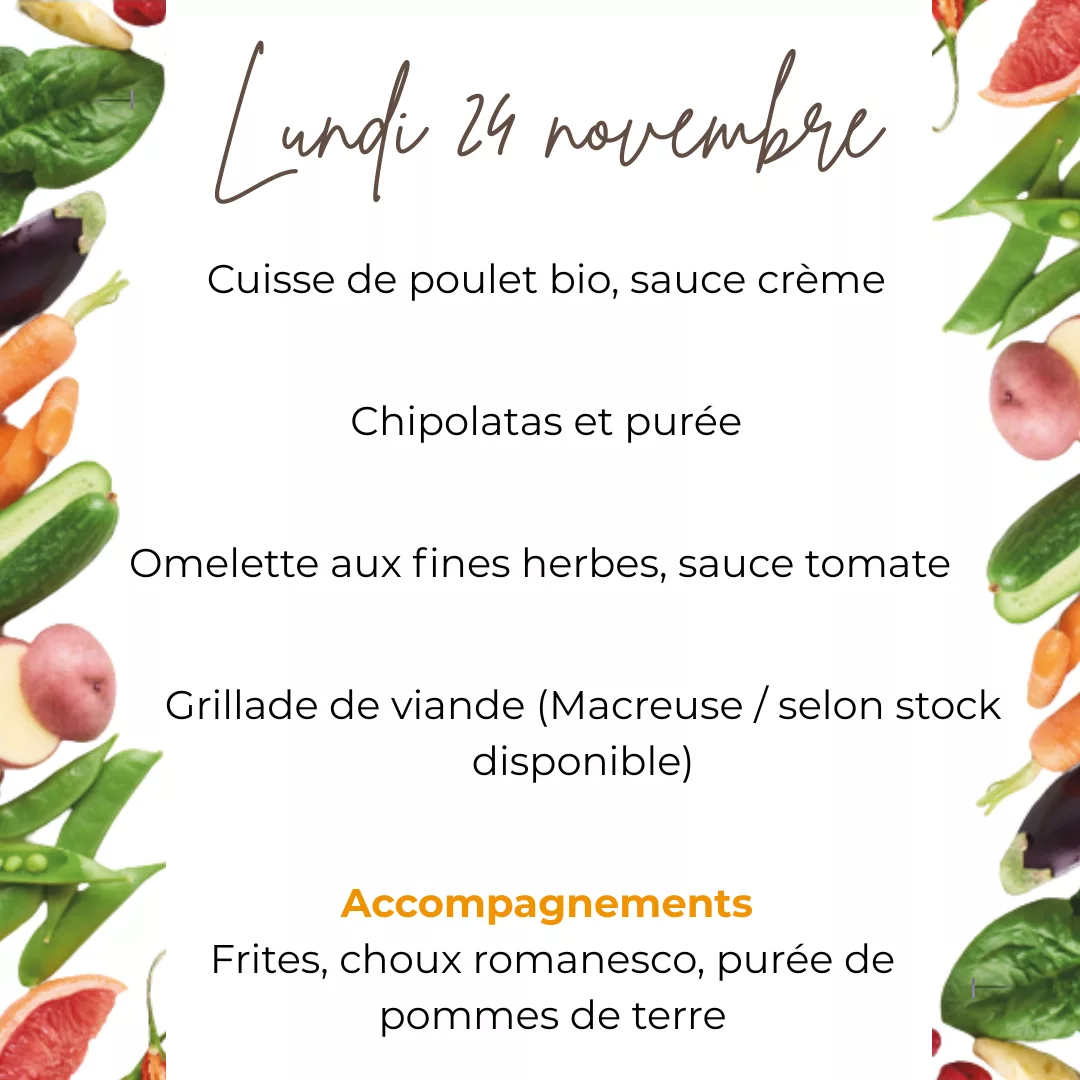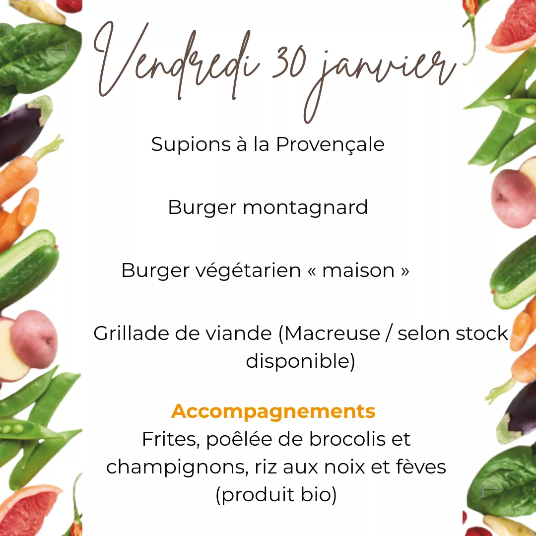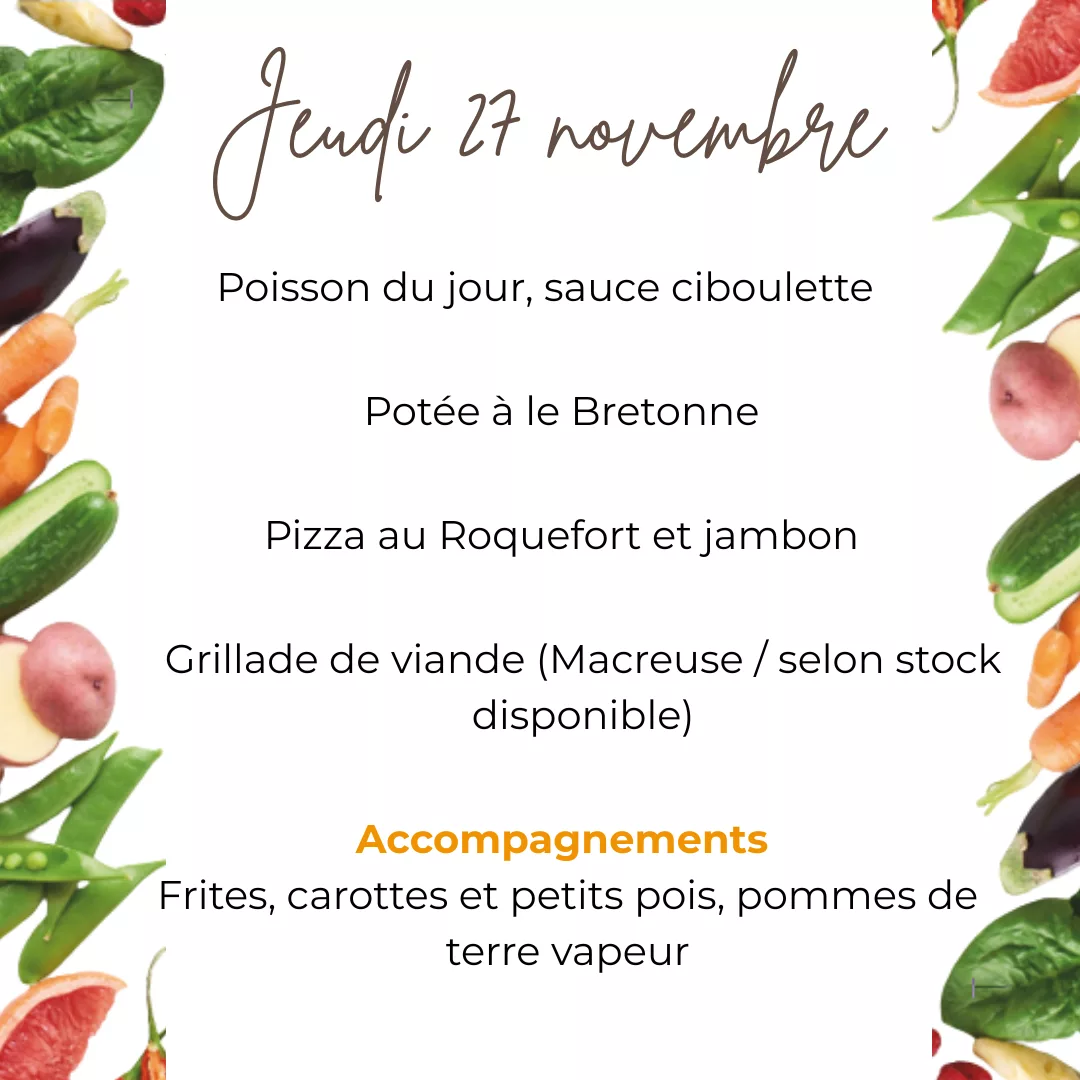 - 1 boisson (eau en 50cl ou vin en 25cl)